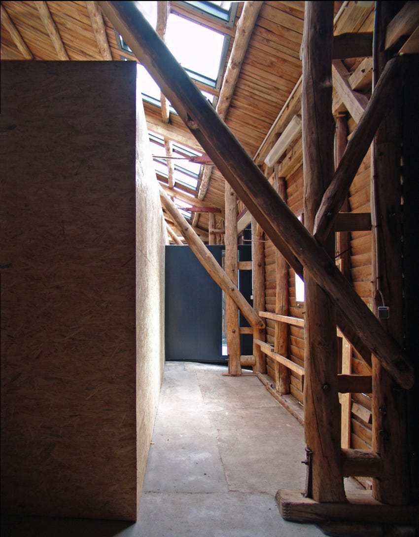 Als kostengünstiger und zudem energetisch und akustisch wirksam mit Holzwolleplatten bekleideter Leichtbau zeigt sich der Einbau im Innenraum der Scheune als Abbild eines eingefahrenen Heustapels.