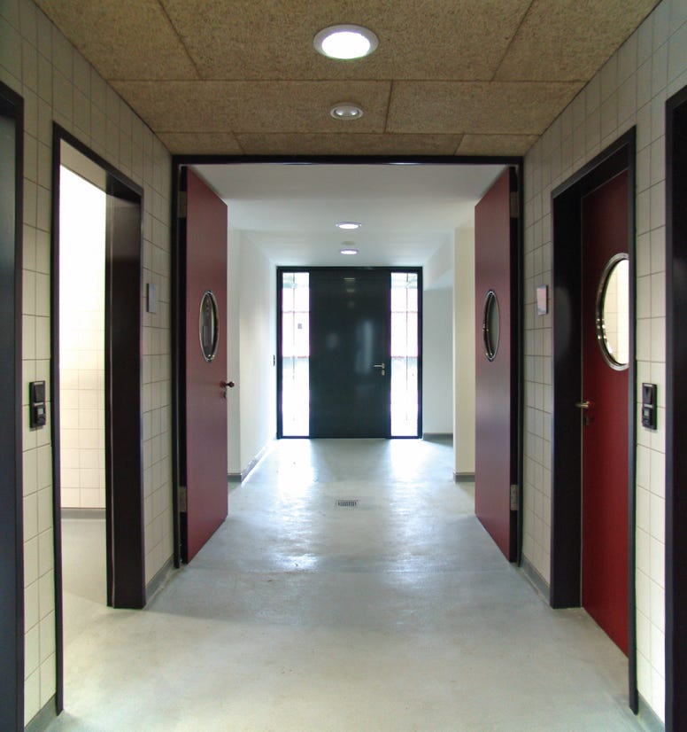 Die Übergänge vom eingestellten Körper zur Hülle der Scheune bilden tiefe, trichterförmige, stählern- verglaste Erker. Neben Lichteinfall und Ausblick dienen sie als Ein- und Ausgänge für Mensch und Tier.