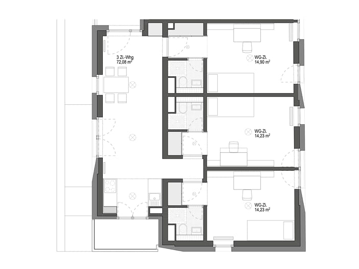 Der Neubauten ist Auftakt eines städtebaulichen Gesamtkonzeptes, welches mittels differenzierter Stadtbausteine eine neue städtebauliche Figur schafft, die als Synthese aus offener Bauweise der bestehenden Studentenwohnanlage und der umgebenden Schwabinger Blockbebauung konzipiert ist.